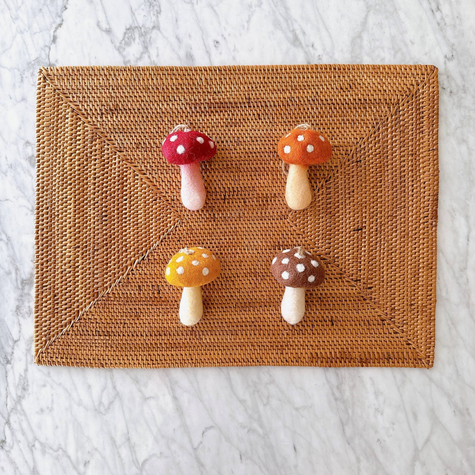 Celebrate the cozy season with these mushroom ornaments in warm autumn tones. Handmade from natural sheep’s wool, each ornament features a charming toadstool design with white polka-dotted caps in red, orange, yellow, and brown.