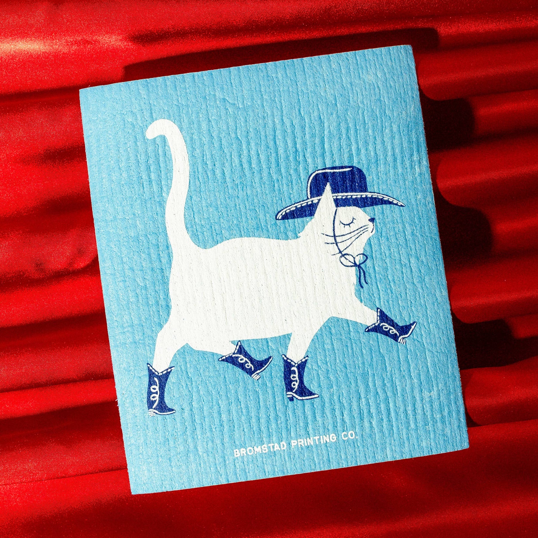 An eco-friendly, biodegradable alternative to rags or paper towels, these sponge cloths can be used over and over to wash dishes and wipe up messes. Use them in place of disposable paper towels or rags. They are 100% compostable at the end of their life. Our Swedish dishcloths are screen-printed with an array of our bestselling illustrations. These are a functional and fun new product sure to complement your other gift and stationery items. This cloth features our iconic cowboy cat, strutting in their hat and boots, screen printed in two colors on a light blue sponge cloth. 172mm x 200mm 70% cellulose • 30% cotton