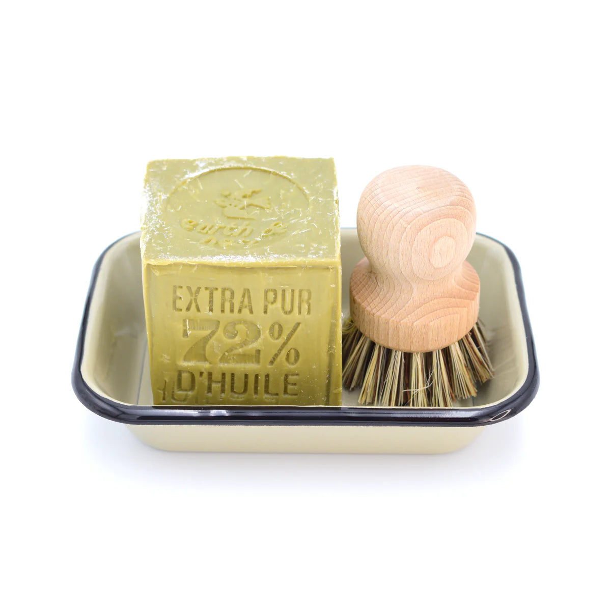 This retro, vintage style enameled porcelain-over-steel soap dish will make you smile every time you reach for the soap. With an antique-chic charm, we have designed it in our Oyster colorway to fit in with any design style. Consisting of two pieces, with a raised base and the inner drip tray lifts out for easy cleaning. The generous dimensions of this dish will accommodate most any soap size. Pair it with a soap and a natural brushes for a gorgeous gift!