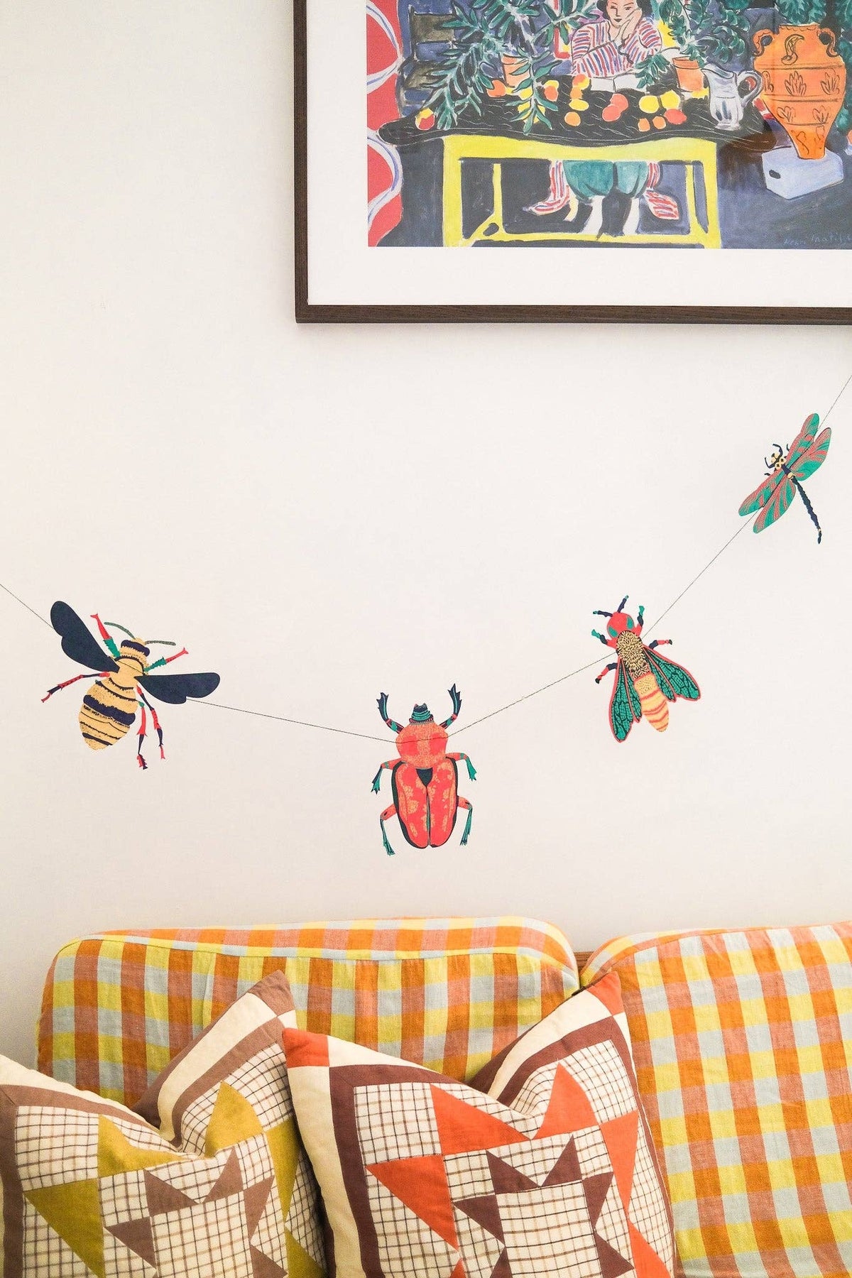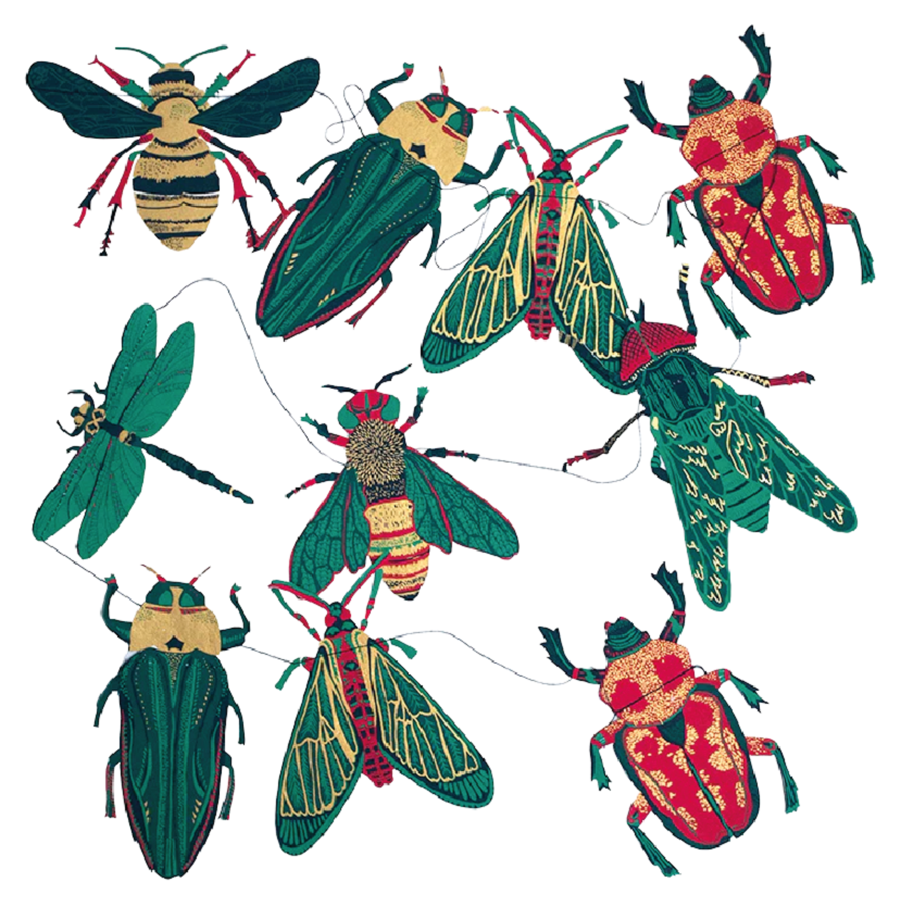 Ten decorative beetles, moths and insects, each adorned with metallic flourishes, are sewn to create this spectacular garland.