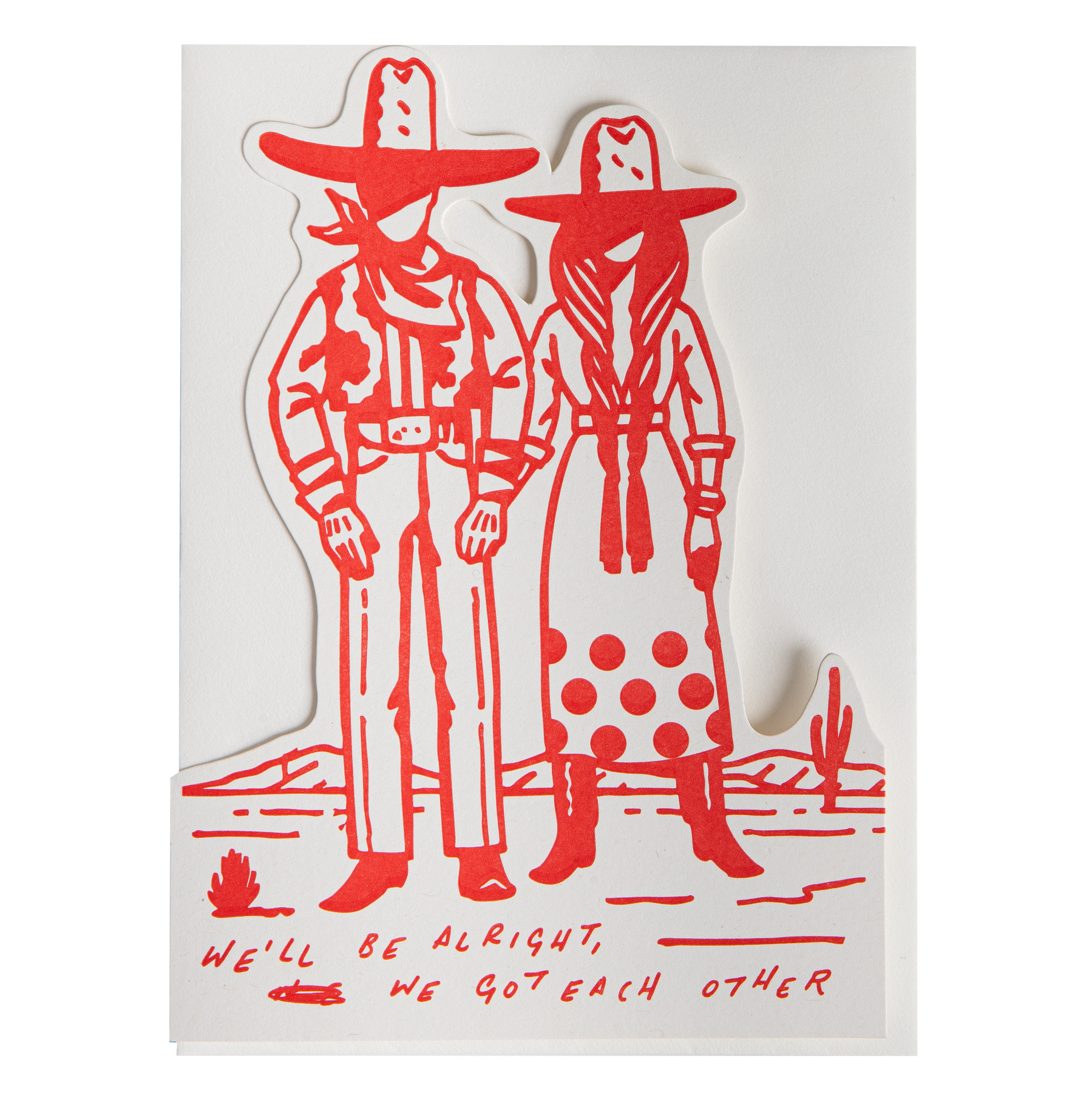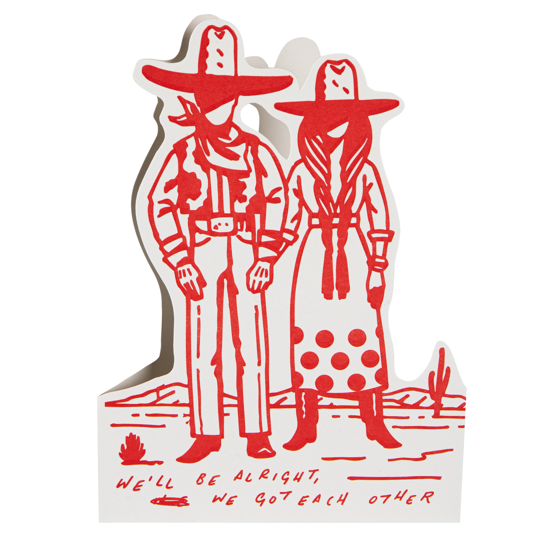 Our letterpress cut-out card featuring a red outline of a cowboy couple and the words 'We'll be alright if we have got each other.' Why send a boring square card when you could send one of these cut-out beauties? They look so good perched on a dresser or mantelpiece, you’ll never want to pop them in the recycling. Receiving one in the post is a little moment of joy.